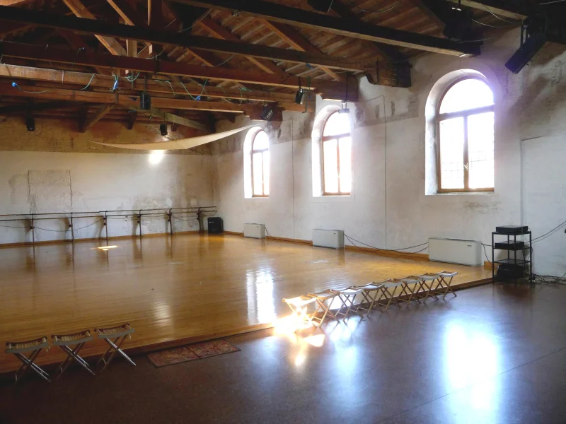 Il C.T.R., Centro Teatrale di Ricerca, è affacciato sul chiostro dell’ex Convento dei Ss. Cosma e Damiano in Giudecca 621, 30133 Venezia Ve. La struttura dispone di un’ampia sede ed è costituita da un atrio spazioso, che funge da sala d’attesa, e due sale. Una scalinata centrale porta dall’atrio alla sala grande, mentre da una porta laterale si accede alla sala piccola. Lo spazio è grande e luminoso, e dispone di varie attrezzature, quali: - Fari teatrali “led” orientabili, sulle travi delle capriate a vista - Tre linee al soffitto di “cantinelle” con carrucole per velari, scenari, sipari - Mixer luci - Mixer suono - Amplificatore - Due casse acustiche EV EVOLVE 30 M (1000 W) - Piano a coda Hoffmann & Kuhne (Dresden). - 60 sedie tipo Thonet in metallo leggero. - 2 tavoli grandi -4 tavoli piccoli