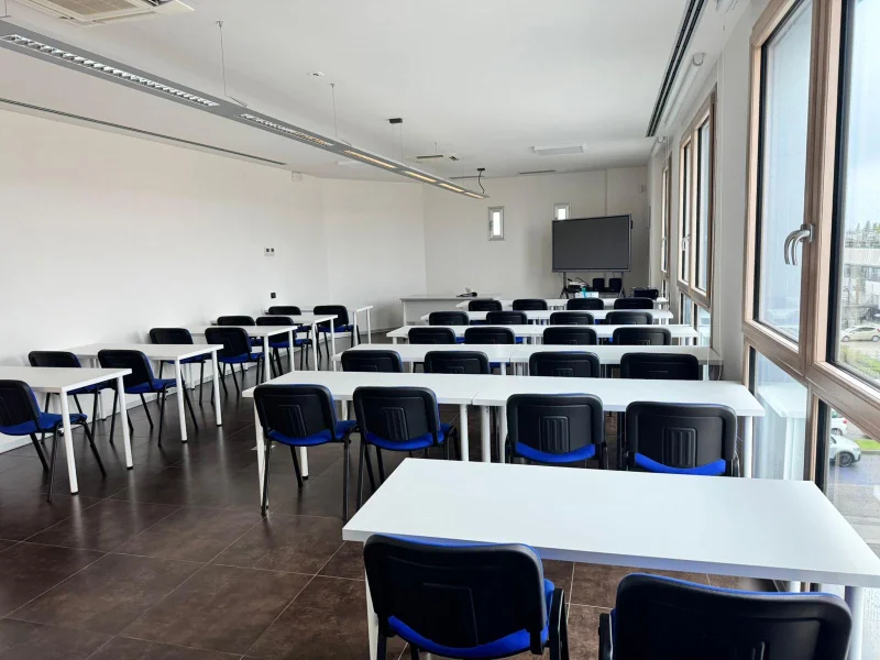 Sala con capienza di 130 postazioni di cui 7 relatori e 123 ospiti.