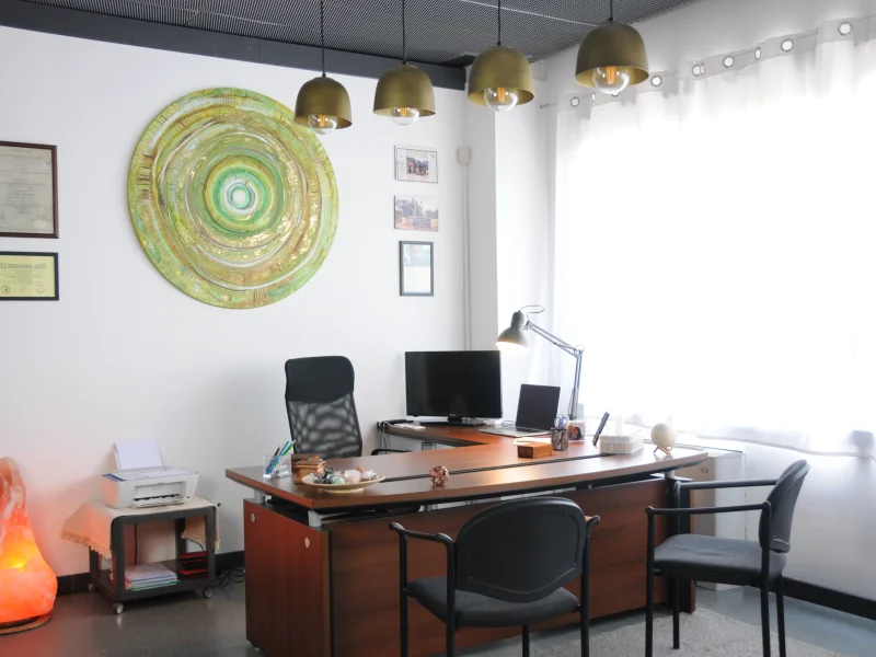 Studio privato luxury, arredato finemente con quadri ed oggestistica (tutti pezzi unici). Scrivania presidenziale con poltrona, poltrona per sessioni (psicoterapia, ipnosi, counseling ecc.), fouton per sessioni di lavoro a terra (ipmnosi, posturologia, osteopatia, fisioterapia). Utilizzabile anche per piccole riunioni di livello alto.