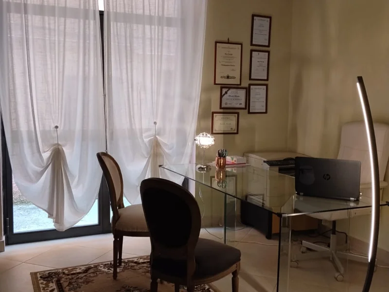 Ufficio progettato per un team di 5 persone, organizzato attorno a un elegante tavolo in cristallo che favorisce collaborazione e confronto. La parete è dotata di lavagna utilizzabile con colori a spirito anallergici, ideale per riunioni e attività di progettazione. L’ambiente è luminoso e funzionale e include anche un lettino da massaggio, pensato per momenti di trattamento o benessere. Su richiesta sono disponibili attrezzature base per fotografi, materiali per attività di psicomotricità.