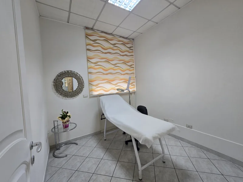 La cabina è luminosa con finestra con vetri privacy e oscurante, è compreso un lettino, una lampada, possibilità di uno o piu carrelli, sono presenti due specchi.
