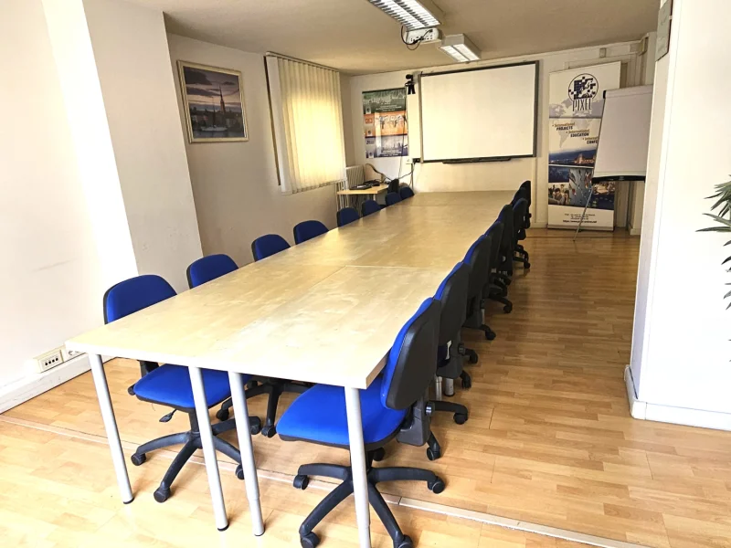 Sala riunioni – 26 mq (fino a 12 posti) Spazio flessibile configurabile con tavolo unico, in modalità aula o teatro. Completamente attrezzata con aria condizionata, tavoli e sedute, lavagna a fogli mobili, schermo, videoproiettore, Wi-Fi e PC per il relatore. Disponibili servizi igienici dedicati, sala d’attesa e segreteria (9.00–18.00) per accoglienza e assistenza. Su richiesta: acqua in sala, coffee break, pranzo, supporto tecnico e stampa documenti