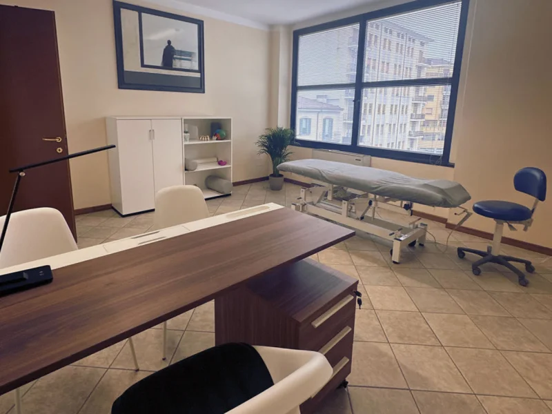 Studio di 20 mq dotato di lettino, scrivania con sedie e armadio
