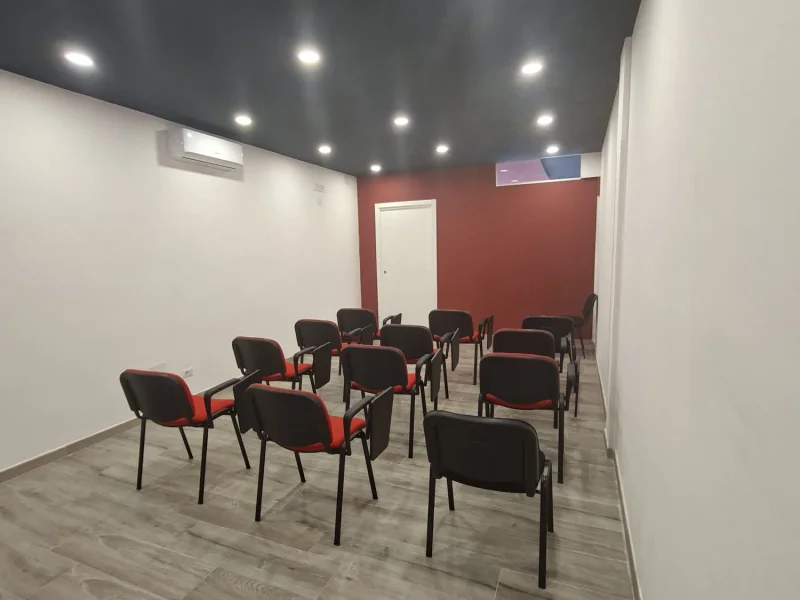 desk accoglienza, sala riunioni e ufficio. Davanti alla fermata della tramvia palazzi rossi