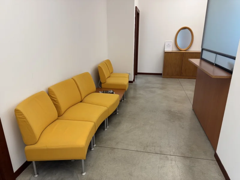 Ufficio situato in un edificio moderno e recentemente ristrutturato, con ingresso indipendente a vetri, con ascensore. La struttura si sviluppa su un corridoio centrale che distribuisce l'accesso ai vari ambienti, con porte indipendenti e pavimentazione in cemento levigato continuo. La reception/sala d'attesa è arredata con divano modulare in tessuto giallo senape, bancone accoglienza in legno e specchio ovale — un ambiente professionale e accogliente per ricevere clienti. L'illuminazione è garantita da pannelli LED a soffitto e luce naturale. L'ambiente è silenzioso, ordinato e condiviso con altri professionisti in un contesto discreto e riservato. A due passi dal mare di Bellaria Igea Marina