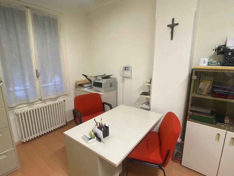 Questa stanza dispone di una scrivania con cassetti, una vetrina porta documenti, un armadietto con chiave, sedia da ufficio e due poltrone